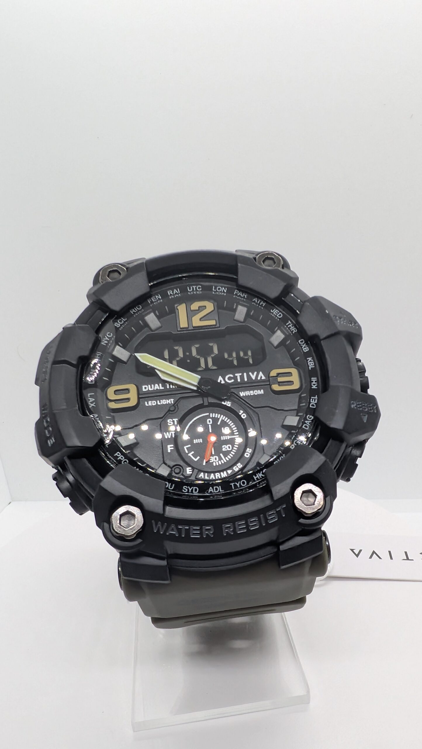 The Activa X BlackOps ChronoTrek ACW1637-002 is a bold, military-inspired digital watch built for durability and everyday utility. Featuring a large 56mm case and rugged army green design, this watch delivers easy readability and a tough aesthetic that fits outdoor, tactical, and active lifestyles. Functions include digital time display, stopwatch, alarm, backlight, and reliable quartz accuracy—ideal for anyone who needs a dependable timepiece on the go. Brand new and unused, it’s perfect for collectors, enthusiasts, or those looking for a practical, modern digital watch with a strong presence.