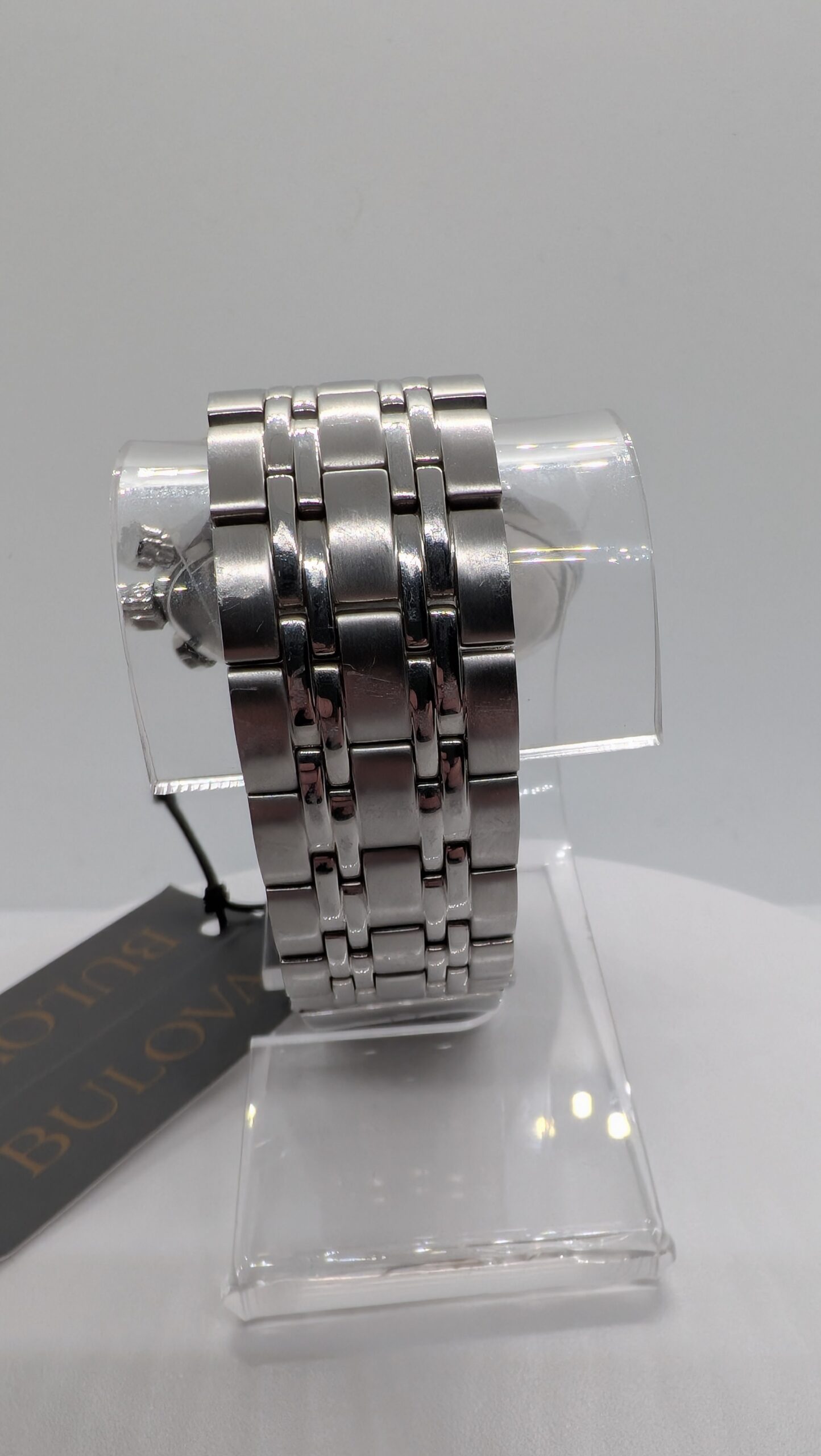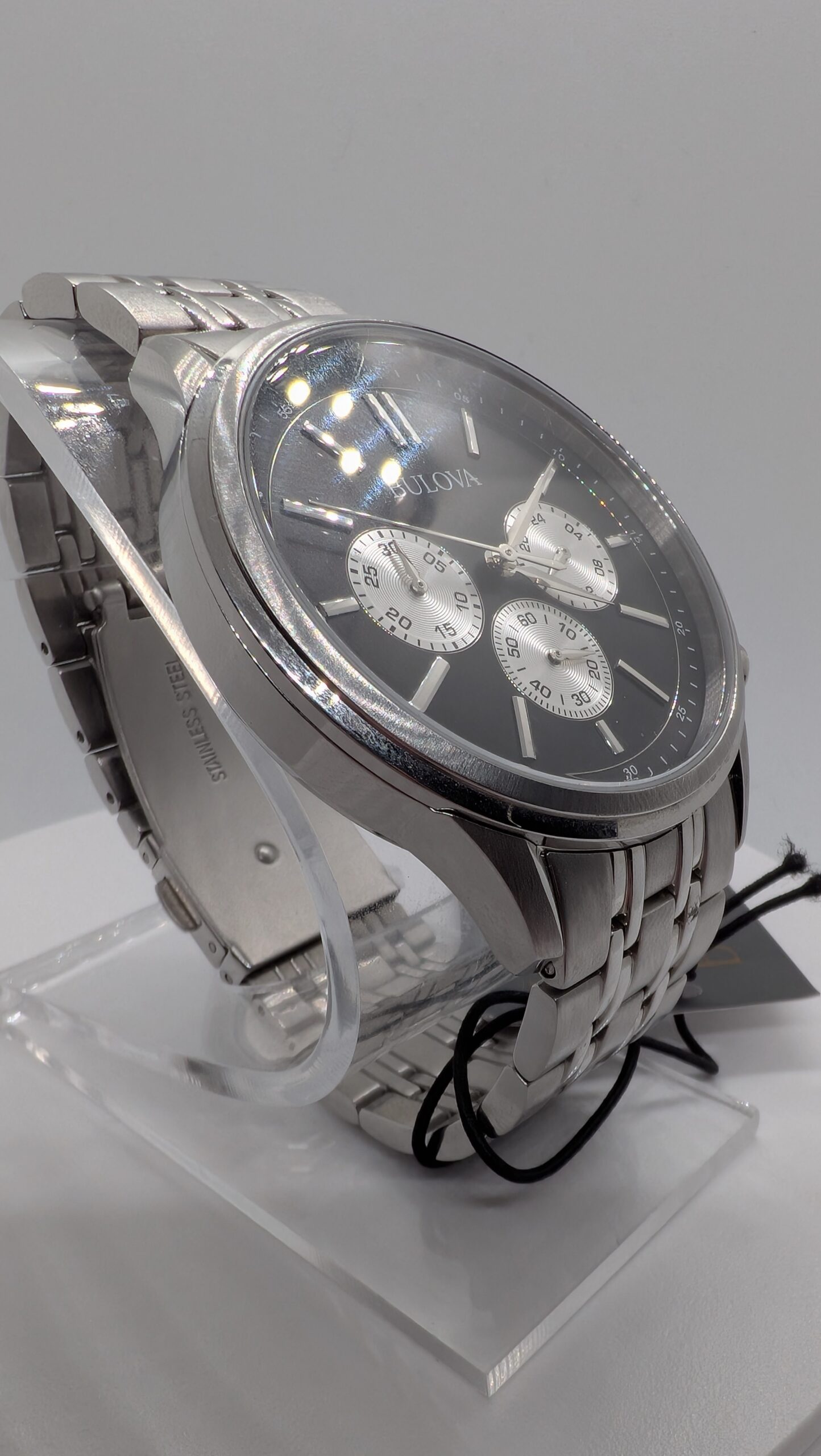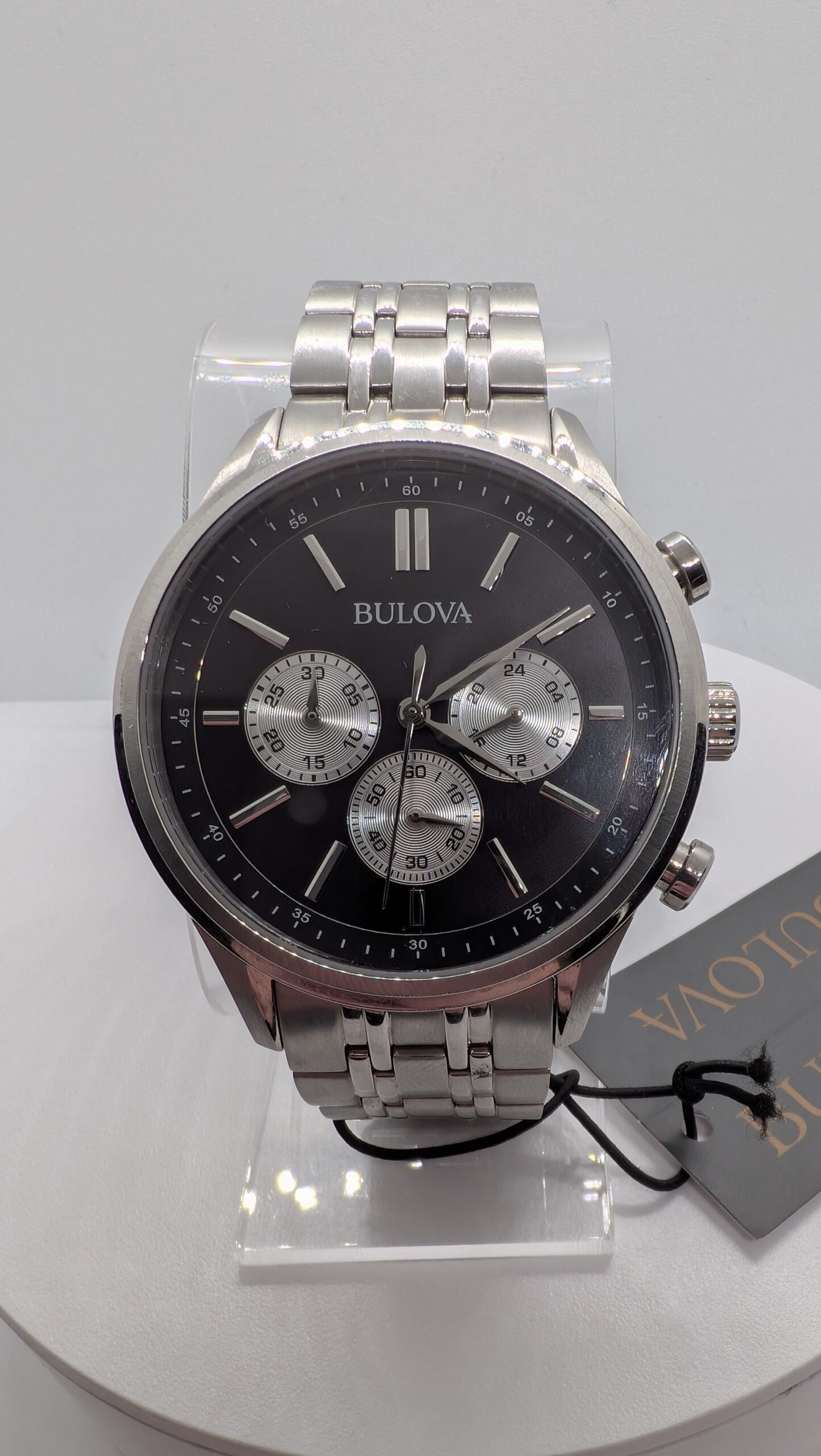 This Bulova Classic Chronograph Men’s Watch (Model 96A295) features a sleek black dial with chronograph sub-dials, housed in a durable stainless steel case and bracelet for a timeless, versatile look. Powered by a reliable quartz movement, this watch offers precise timekeeping and classic Bulova craftsmanship suitable for both everyday wear and formal occasions.