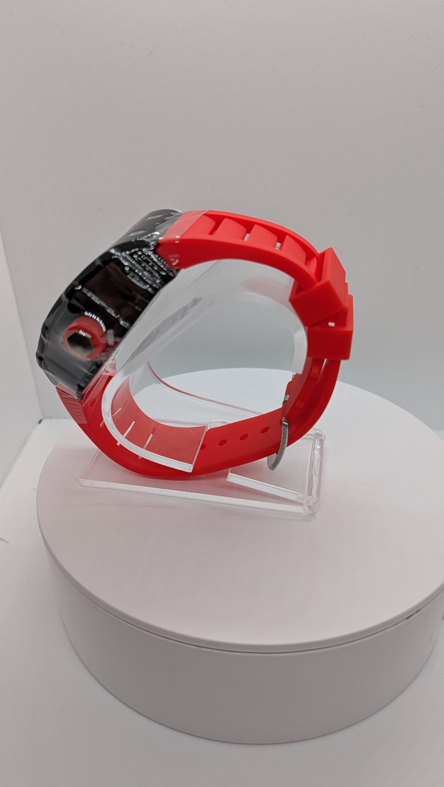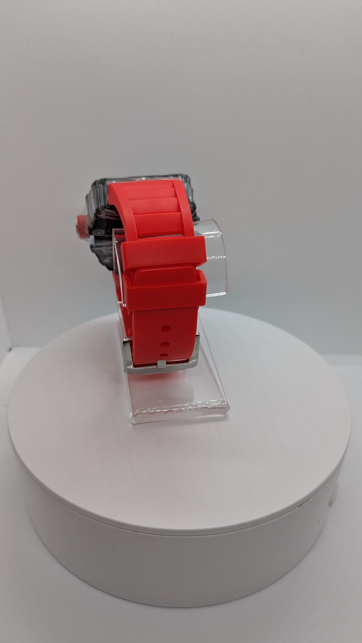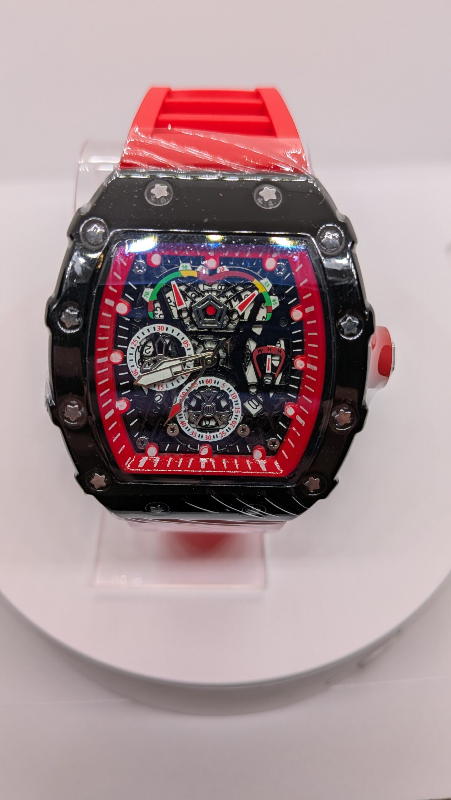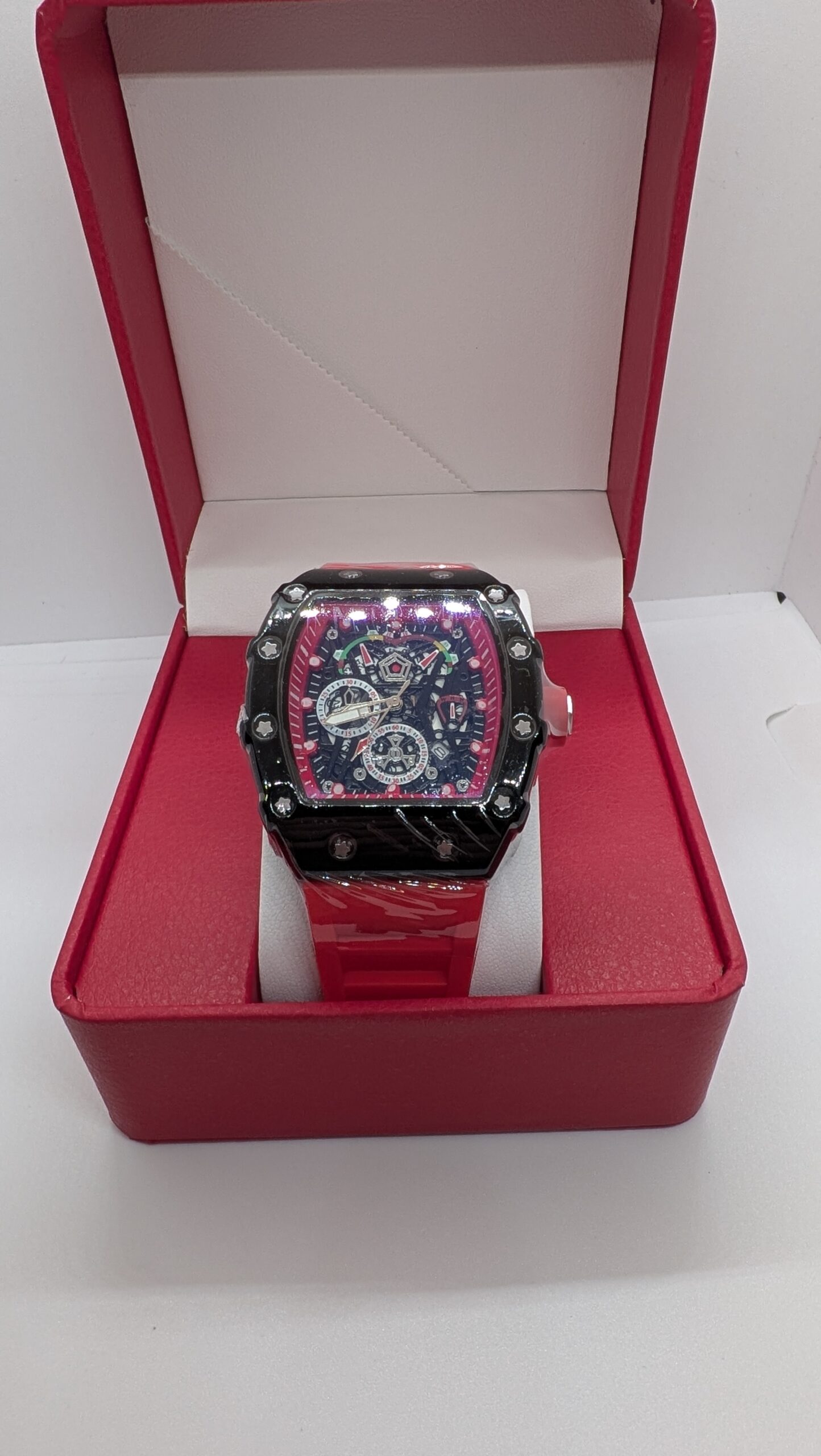 Stylish Luxury Skeleton Dial Tonneau Case Red Rubber Strap Sport Style