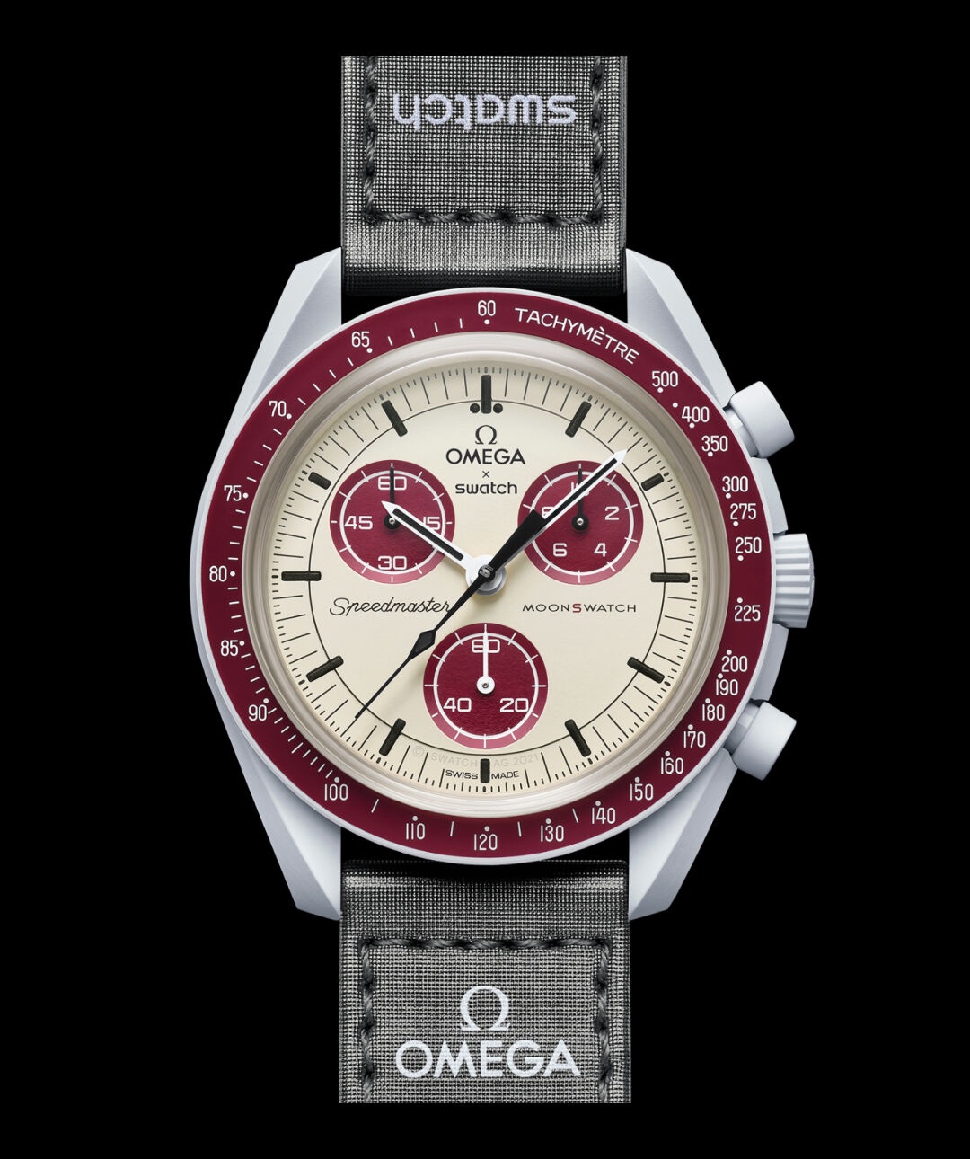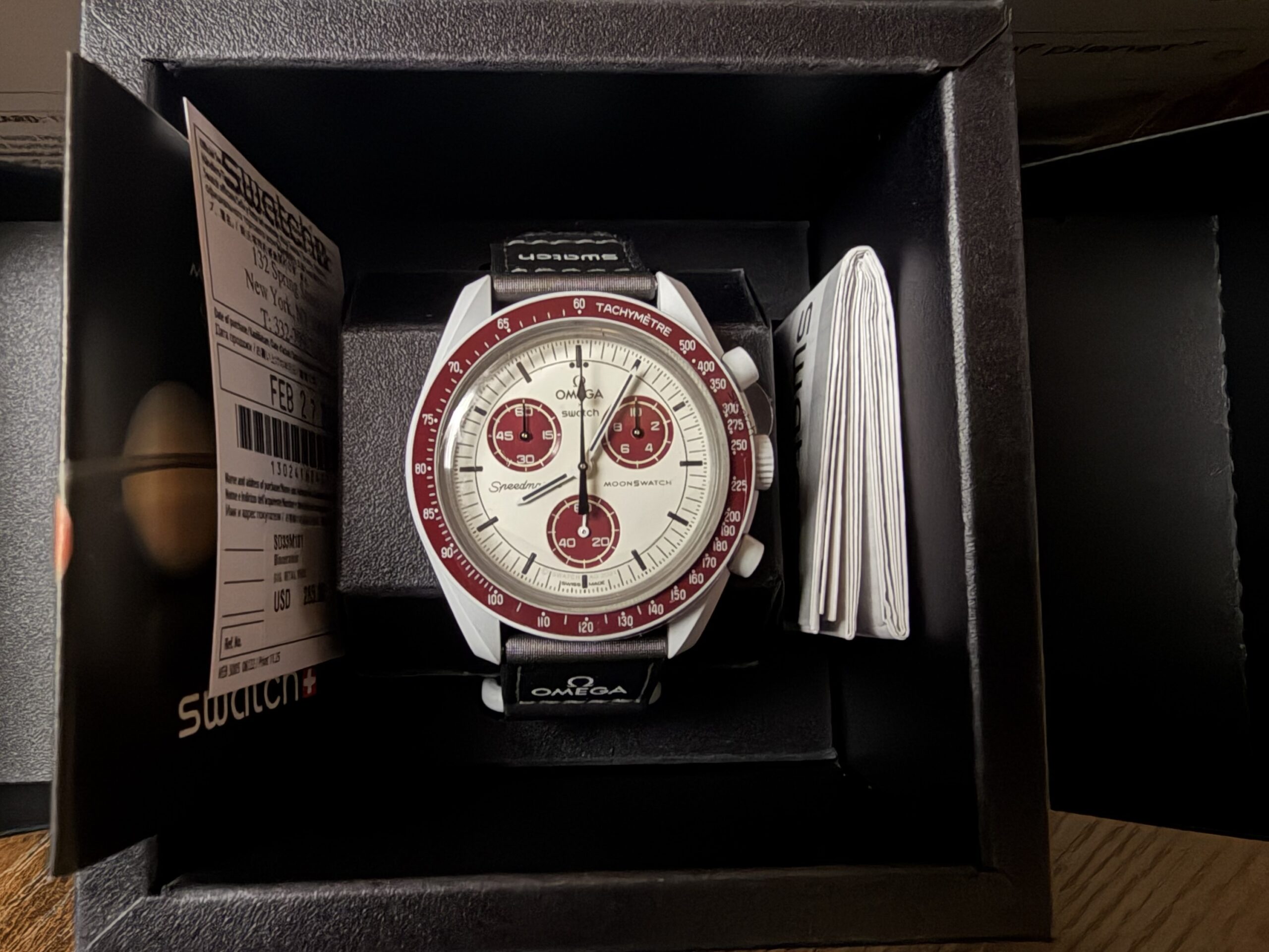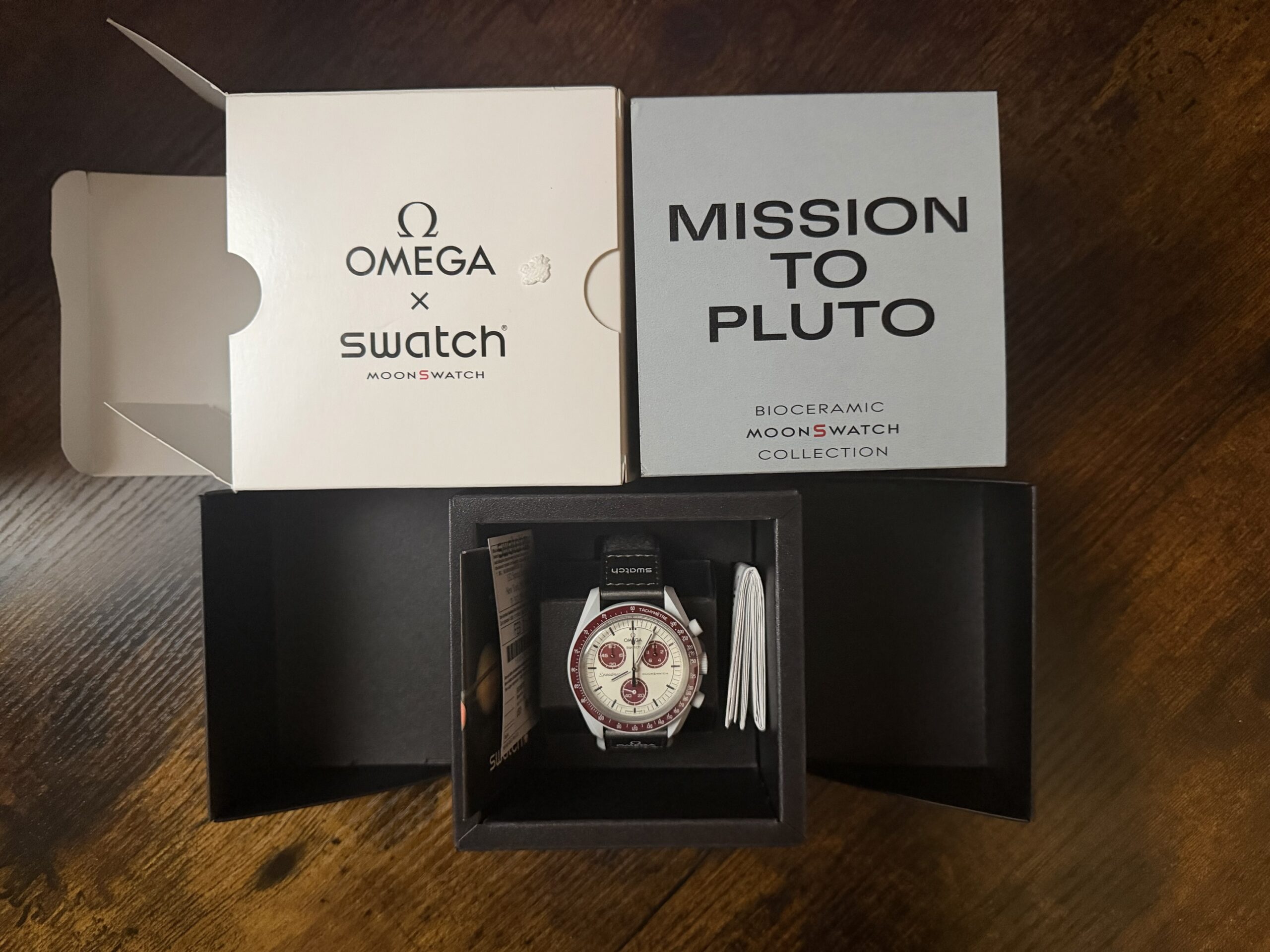 For sale is a brand new, never worn Omega x Swatch MoonSwatch Mission to Pluto (42mm). This highly sought-after collaboration between Omega and Swatch blends iconic Speedmaster-inspired design with innovative Bioceramic material. The Mission to Pluto features a rich burgundy case and strap, quartz chronograph movement, tachymeter bezel, and bold subdials that pay tribute to the legendary Speedmaster aesthetic.